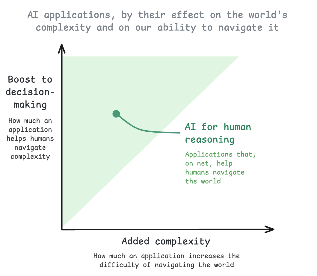 There is a broad and very high-dimensional space of potential AI capabilities. Some of these capabilities will (if properly adopted by society) improve the quality of human understanding and decision-making, by more than they make the world more complex and difficult to understand. This is what we call AI for human reasoning (see image)